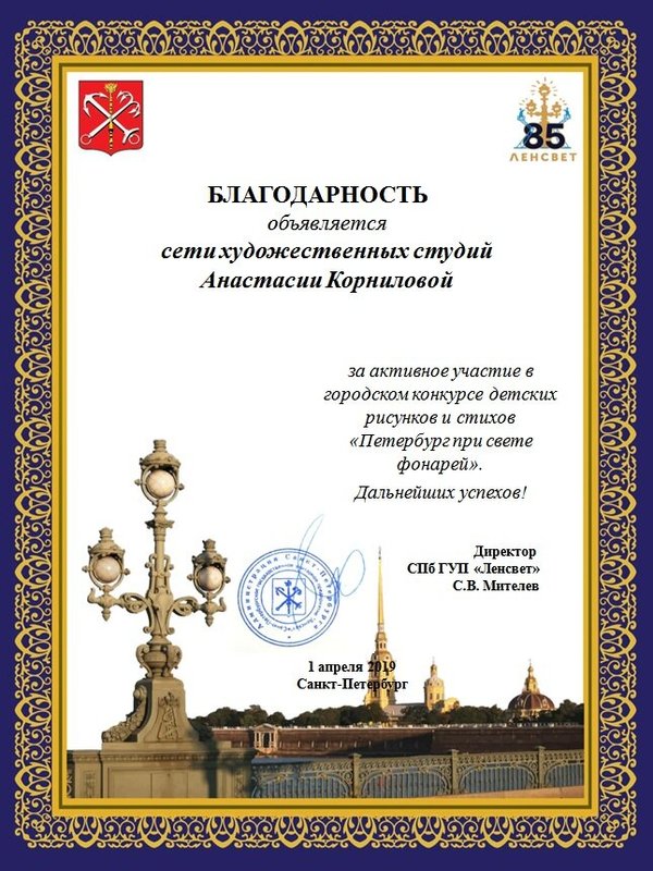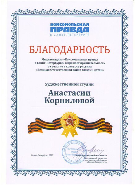 1) Победитель II Междунаролного конкурса детского рисунка «Я помню! Я Горжусь!» в рамках VII Международной молодёжной научно-практической конференции «Великая Отечественная Война 1941-1945 годов в исторической памяти народа» (2014 год).